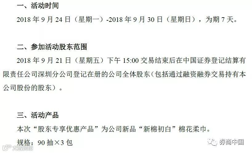 公告中提到,本次“股东专享优惠产品”为公司新品“新棉初白”棉花柔巾。公告中对于参加活动股东的范围也进行了限制: