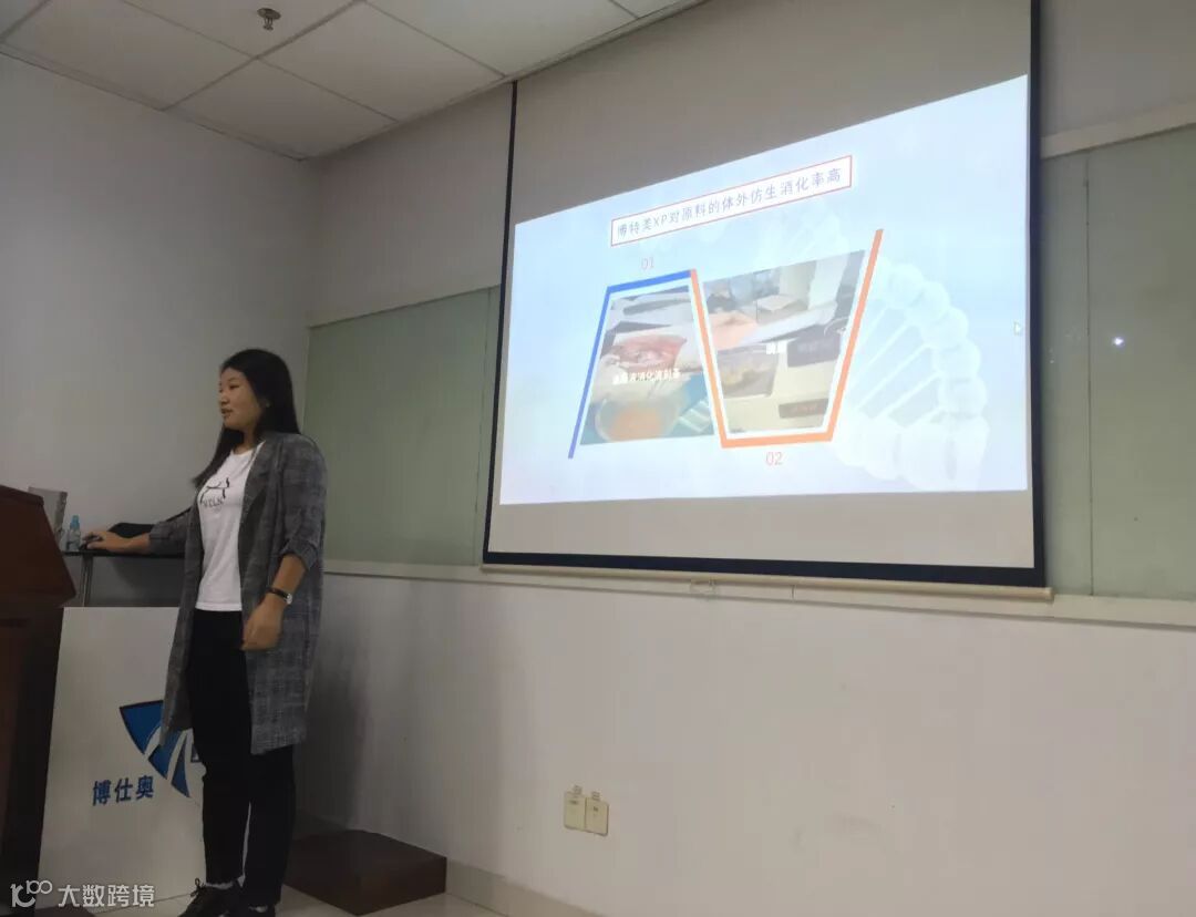 水产事业部经理吴先彬先生及技术部主任黄明媛女士向大家介绍了博仕奥酶制剂在水产上的应用,并特别介绍了博仕奥耐高温蛋白酶博特美XP。博特美XP具有耐高温、能过胃及消除抗营养因子等特点,且对蛋白质的消化率高。随后大家就蛋白酶在水产上的应用展开热烈的讨论,来访的几位领导对于博仕奥酶制剂在水产上的应用给予了充分肯定。