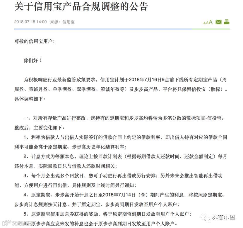 据悉,信用宝在2018年7月15日发布信用宝产品合规调整的公告,计划于2018年7月16日9点前下线所有定期宝产品(周周盈、策诚月盈、单季满盈、双季满盈、策诚年盈等)及步步高产品,平台将只保留散标),对所有存量产品进行整改,持有的定期宝和步步高均将转为多笔分散的散标项目-信投宝,持有时间根据匹配债权时间来定。