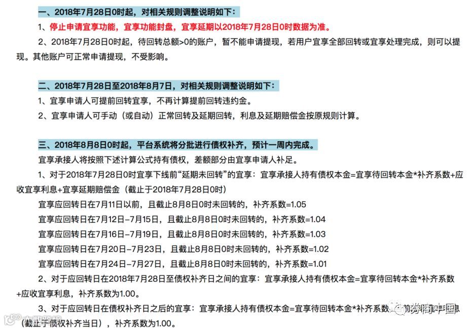 在2018年7月28日至2018年8月7日,宜享申请人可提前回转宜享,不再计算提前回转违约金;宜享申请人可手动(或自动)正常回转及延期回转,利息及延期赔偿金按原规则计算。2018年8月8日起,平台系统将分批进行债权补齐,预计一周内完成。