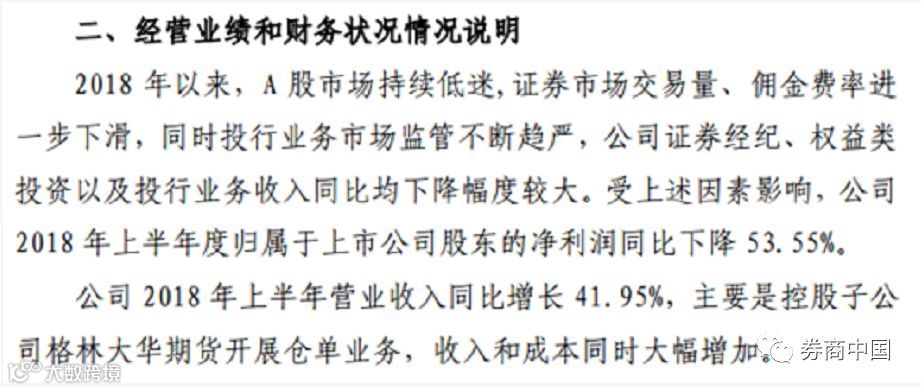 山西证券对上半年业绩和财务状况进行情况说明:2018 年以来,A 股市场持续低迷,证券市场交易量、佣金费率进 一步下滑,同时投行业务市场监管不断趋严,公司证券经纪、权益类投资以及投行业务收入同比均下降幅度较大。公司 2018 年上半年营业收入同比增长 41.95%,主要是控股子公司格林大华期货开展仓单业务,收入和成本同时大幅增加。
