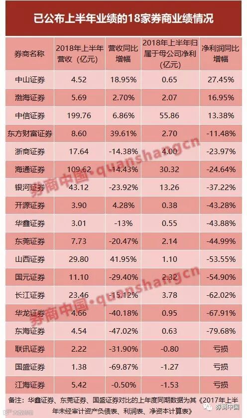 26日晚间,中国银河证券和山西证券分别发布了2018年上半年业绩快报。至此,已有18家券商披露上半年未经审计业绩情况,有15家净利同比下滑,其中3家亏损。另有3家券商净利润逆势增长,分别是中信证券、中山证券、渤海证券。
