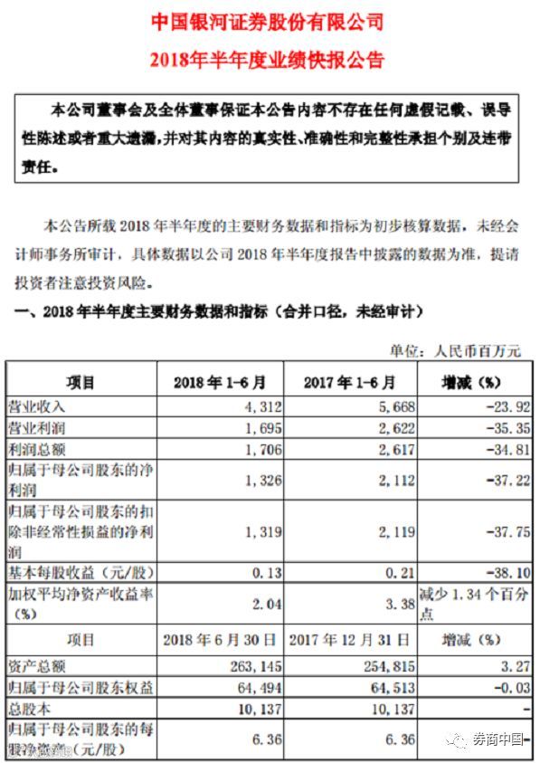 银河证券在业绩情况说明中表示,2018 年上半年,股票市场震荡下行,上证综合指数降幅 14%,深证成分指数降幅 15%。公司继续坚持稳健经营,有序推进各项业务开展。