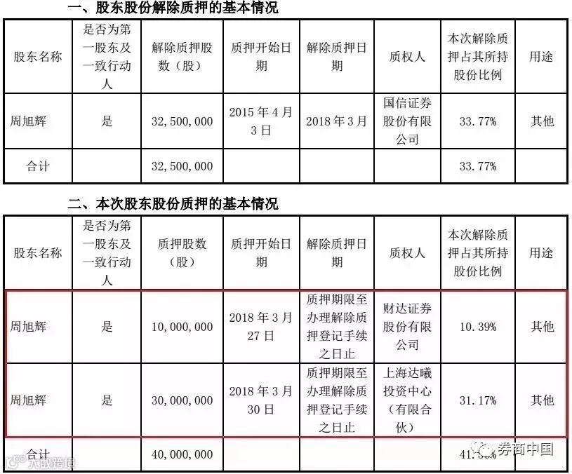 公告中还提到,截止本公告披露日,周旭辉先生共持有公司股份9625.12万股,占公司股份总数的27.98%;周旭辉累计质押股份9201.6万股,占其持有公司股份总数的95.60%,占公司总股本的26.75%。