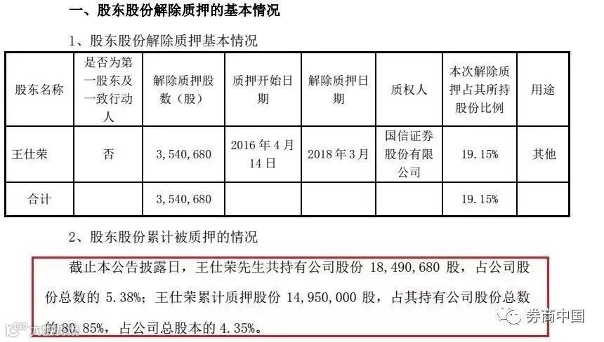 3月29日的公告中提到,二股东王仕荣的354万股已于3月份从国信证券处解除质押。不过,整体来看,截止3月29日,王仕荣先生共持有公司股份1849.07万股,占公司股份总数的 5.38%;王仕荣累计质押股份1495万股,占其持有公司股份总数的80.85%,占公司总股本的 4.35%。