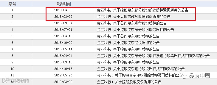 查看*金亚发布关于质押的公告可以发现,2018年仅有两份质押公告:一份为解除质押公告,一份为再质押公告。