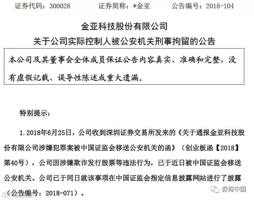 7月26日,*金亚发布公告称,近日,公司从周旭辉家属处获悉,周旭辉先生因涉嫌欺诈发行股票罪,现已被四川省公安厅直属公安局刑事拘留。案件目前尚待公安机关进一步调查。