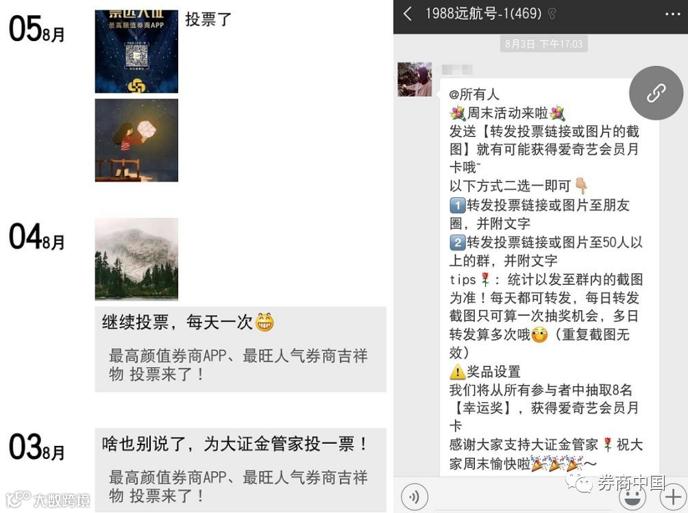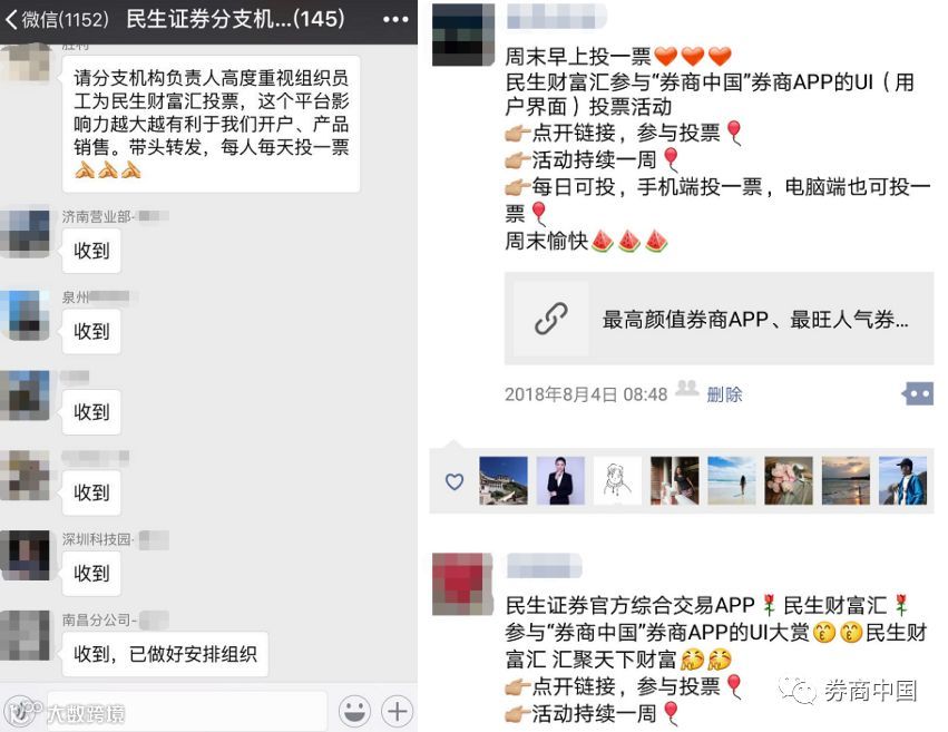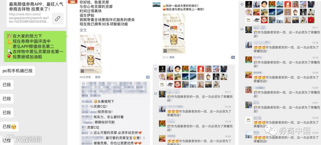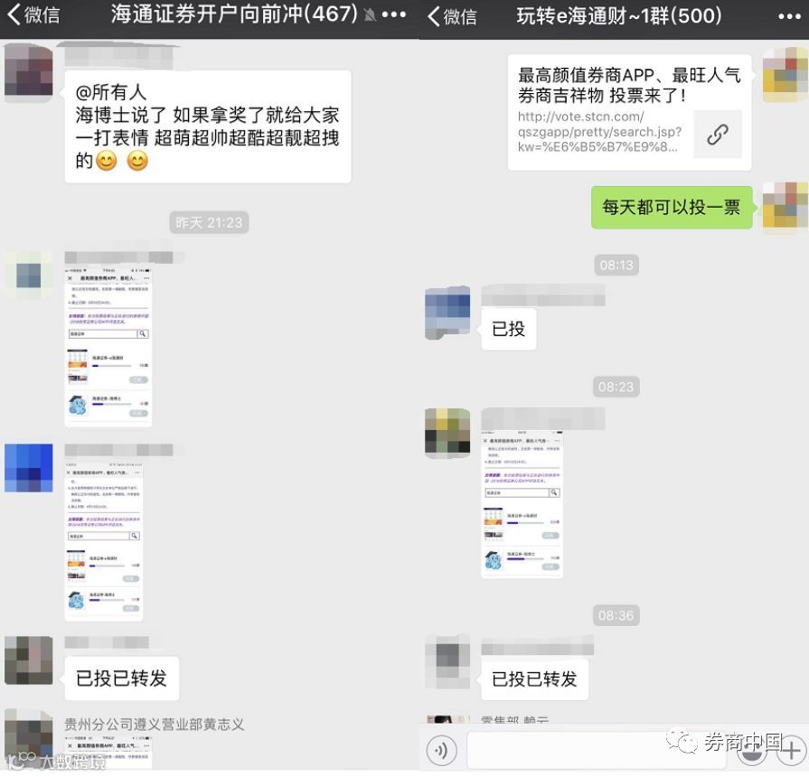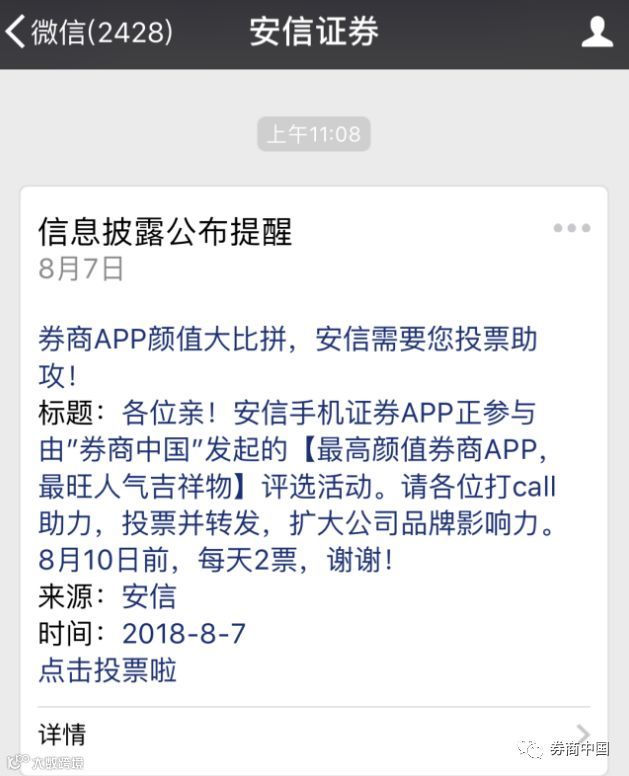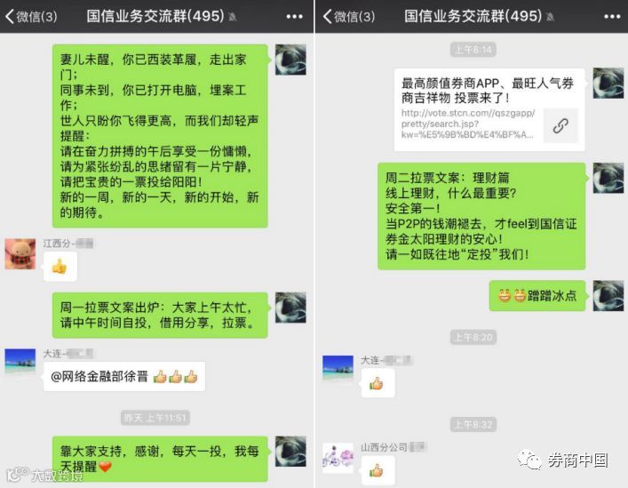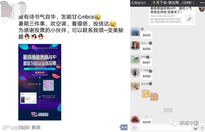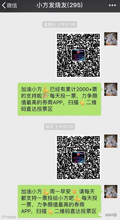 除了每日更换拉票口号转发朋友圈和微信群、制作拉票海报贴在线上线下更多渠道以外,竟还有券商把投票海报放到了内网。也有券商通过官方微信渠道向内部员工1对1定向推送消息,每天准时提醒……