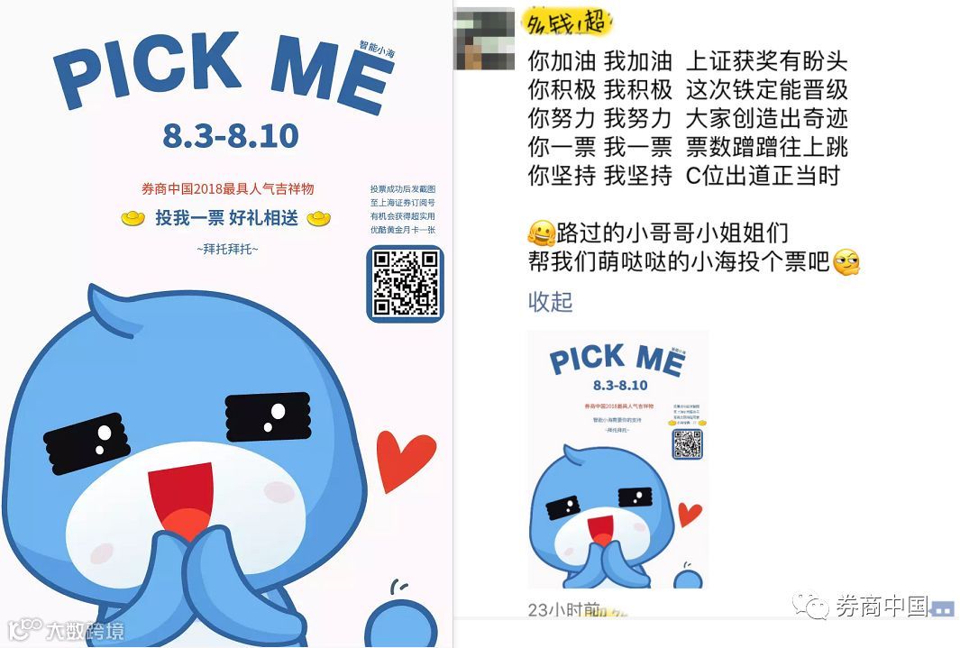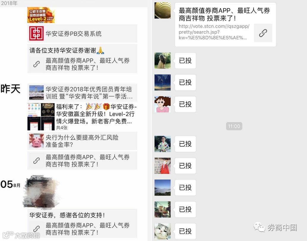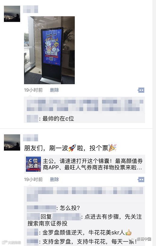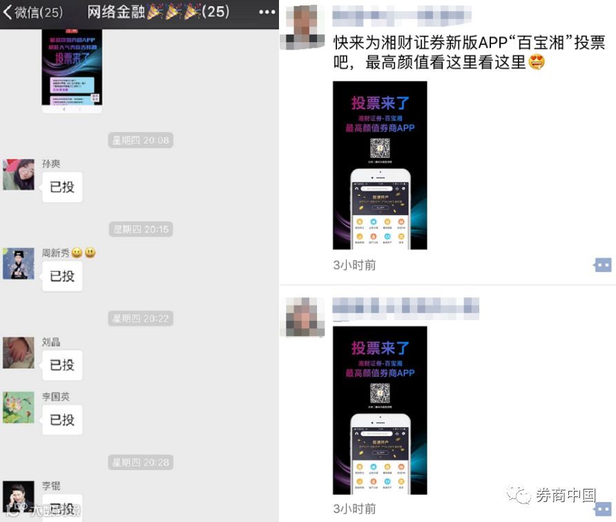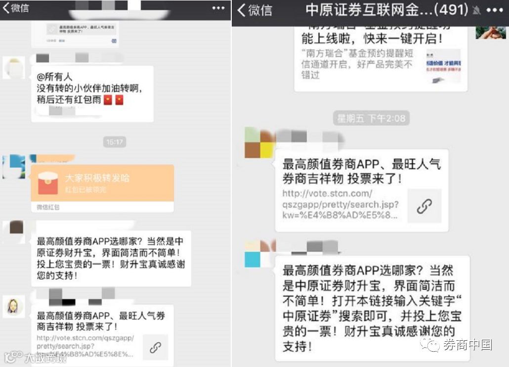 除了每日更换拉票口号转发朋友圈和微信群、制作拉票海报贴在线上线下更多渠道以外,竟还有券商把投票海报放到了内网。也有券商通过官方微信渠道向内部员工1对1定向推送消息,每天准时提醒……
