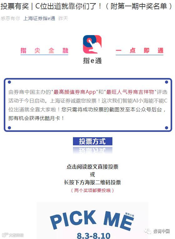 一是上海证券微信推文宣传拉票,配合每日抽奖活动,增加用户投票积极性。在官方微信推文《投票有奖 | C位出道就靠你们了!(附第一期中奖名单)》