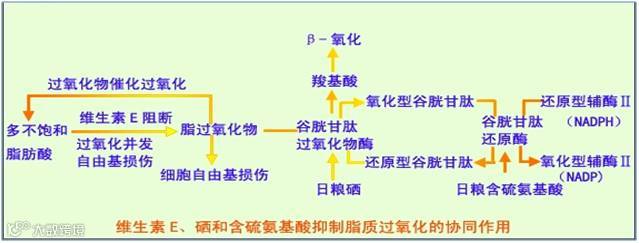 3、提高动物体本身的抗氧化能力是关键。如使用高吸收率与储存率的奥尔硒等(高温季节200-250g/吨饲料)、维生素E,大幅提高动物机体的抗氧化与抗应激能力。这些物质对机体的抗氧化能力协同作用如下图。