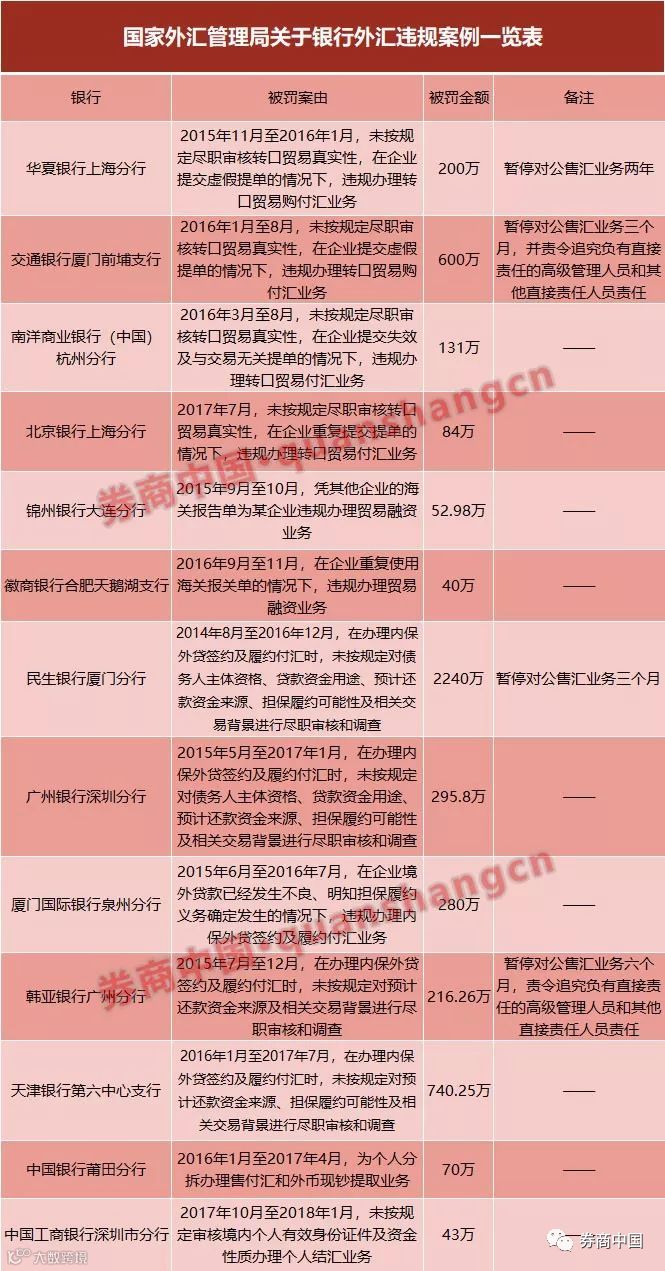1,银行违规:违规办理转口贸易、内保外贷,违规办理个人分拆售付汇;