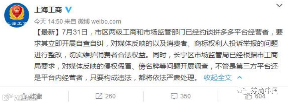 随后,上海市工商局今日发布消息称,7月31日,上海市区两级工商和市场监管部门已经约谈拼多多平台经营者,要求其立即开展自查自纠,对媒体反映的以及消费者、商标权利人投诉举报的问题进行整改,切实维护消费者合法权益。