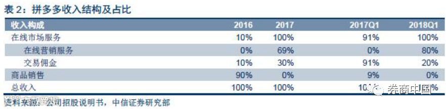 拼多多成立之初定位为B2C自营生鲜电商,主要赚取商品进货与销售差价,2017年一季度后彻底放弃自营业务,逐步向在线营销服务转型,以关键词广告、陈列广告为主要收入来源,仅收取较低的平台交易佣金,2016年自营平台销售收入达到90%,而到2017年一季度,平台交易佣金收入占营收比例达到92%。