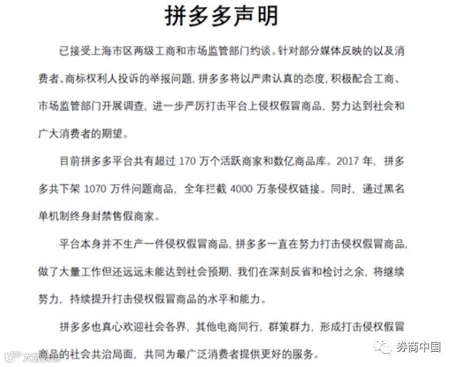 8月1日下午,拼多多发布声明称,将全力配合工商、市场监管部门开展调查,进一步严厉打击平台上侵权假冒商品,努力达到社会和广大消费者的期望。同时,拼多多在声明中表示,真诚欢迎社会各界群策群力,形成打击侵权假冒商品的社会共治局面,共同为最广泛消费者提供更好的服务。