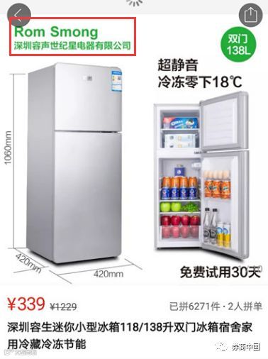 此外,冰箱类电器也有不少类似的山寨产品,例如海信集团旗下的容声(Ronshen)冰箱,拼多多上有包括Roshelle和Rom Smong等生产厂家分别为深圳容声生活电器有限公司和深圳容声世纪星电器有限公司的产品,双门小冰箱分别为340元和339元。