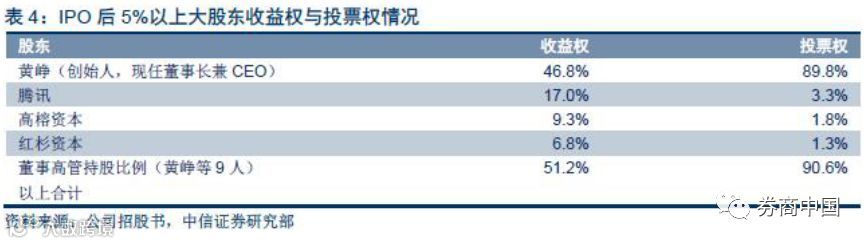 招股书显示,拼多多也采用VIE同股不同权的结构,创始人黄峥是现任董事长兼CEO,IPO后,黄峥拥有46.8%的股权和89.8%的投票权,腾讯拥有17%的股权和3.3%的投票权,高榕资本和红杉资本分别持股9.3%和6.8%,分别享有1.8%和1.3%的投票权。