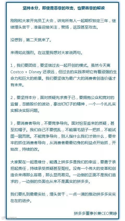此外,7月31日,黄峥发布全体员工信称:“坚持本分,即使是恶意的攻击,也要善意的解读。一边倒的正面不是我们追求的,一边倒的负面也从来不是真实的拼多多。要坚持本分,面对质疑先求责于己,一个一个扎扎实实解决实际问题。要消费者导向,不要竞争导向。要牢牢的抓住消费者导向,从消费者最最切身的利益点开始改。所有员工的期权将锁定三年,继续埋头苦干。”