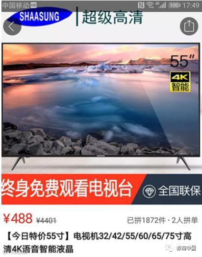 例如,与韩国三星(SAMSUNG)类似的高清电视机,就有(SHAASUNG)55寸高清电视机,只需要500元,拼团488元,同样是“7天退换,假一赔十”,销售已经到1872件,包括晒图的商品评价322条。