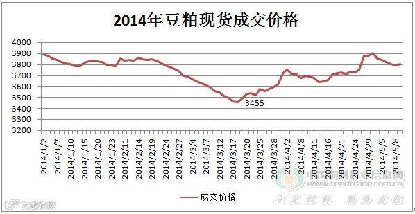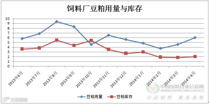 3月开始豆粕用量逐渐增加,不过饲料厂豆粕库存水平偏低,采购较为谨慎。4月中下旬开始,生猪市场转暖,家禽市场自禽流感后(3月中下旬开始)一直处于回暖状态,导致饲料产量增长,豆粕用量增加。不过饲料厂豆粕库存依旧偏低,大概保持在10-15天左右。