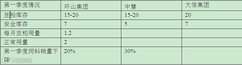 上个表格是第一季度调查山东饲料厂的一些情况,主要是猪料销量下滑在20-30%,豆粕安全库存一周左右,一般豆粕购买库存使用量是15-20天。