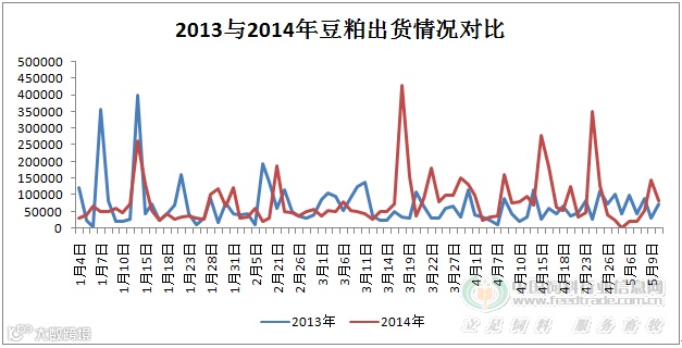 豆粕出货情况也是3月中下旬开始转好,与13年走势正好相反:主要原因是下游养殖业的转变以及13年的巴西物流瓶颈。