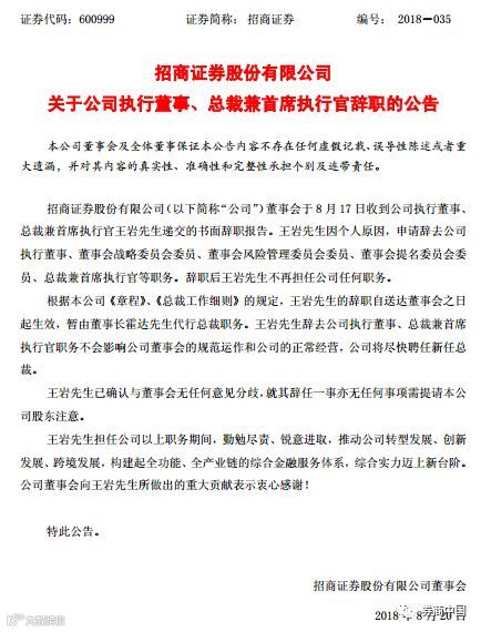 招商证券今日晚间发布公告,王岩先生因个人原因,申请辞去公司执行董事、董事会战略委员会委员、董事会风险管理委员会委员、董事会提名委员会委员、总裁兼首席执行官等职务。辞职后王岩先生不再担任公司任何职务。