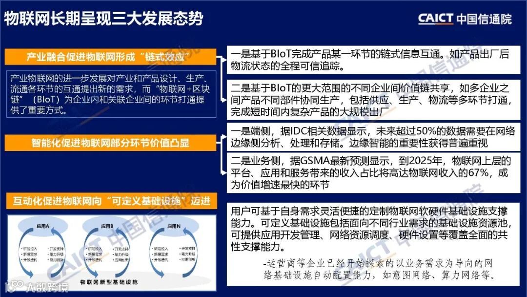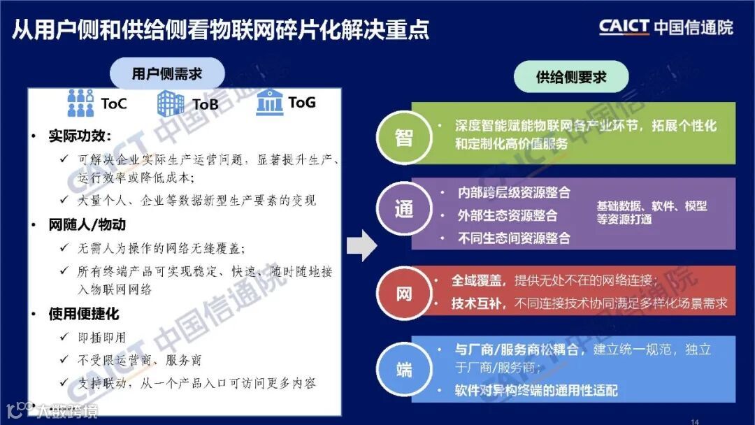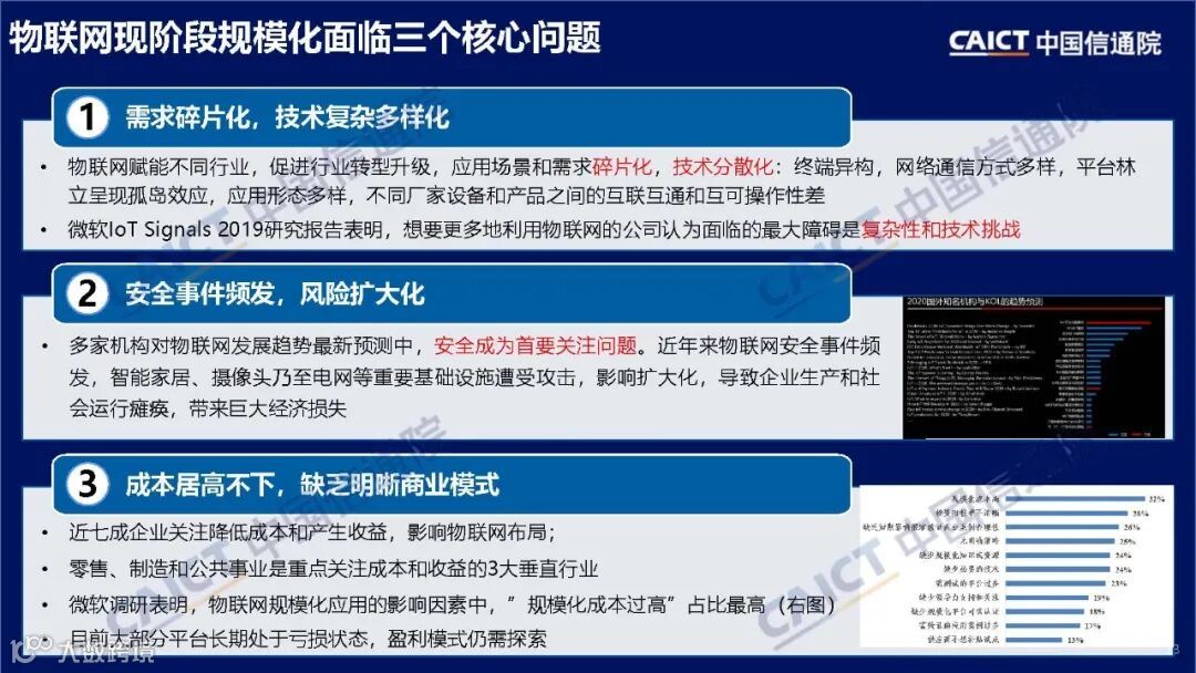 本次是中国信通院第六次发布物联网白皮书,物联网已历经超过十年的发展时期,尤其是近几年,物联网的发展动能不断丰富,市场潜力获得产业界普遍认可,发展速度不断加快,技术和应用创新层出不穷,物联网高速发展已成必然之势。随着物联网被明确定位为我国新型基础设施的重要组成部分,成为支撑数字经济发展的关键基础设施,其面临的碎片化、安全风险、成本高必将成为未来规模化发展的关键难题。本白皮书从用户侧和供给侧出发,分析物联网三大核心问题的需求,总结问题涉及关键环节的发展现状及问题,给出针对性策略建议,希望能够与业内同仁共享成果,共谋发展,共话未来!
