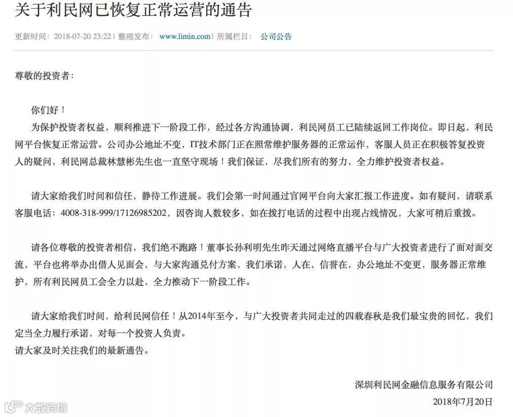 在7月20日夜里11点,利民网再发公告称,为保护投资者权益,顺利推进下一阶段工作,经过各方沟通协调,利民网员工已陆续返回工作岗位。即日起,利民网平台恢复正常运营。公司办公地址不变,IT技术部门正在照常维护服务器的正常运作。并且,利民网总裁林慧彬先生会一直在公司现场,董事长孙利明先生也通过网络直播平台与投资者进行面对面交流,平台也将举办出借人见面会,与大家沟通兑付方案。