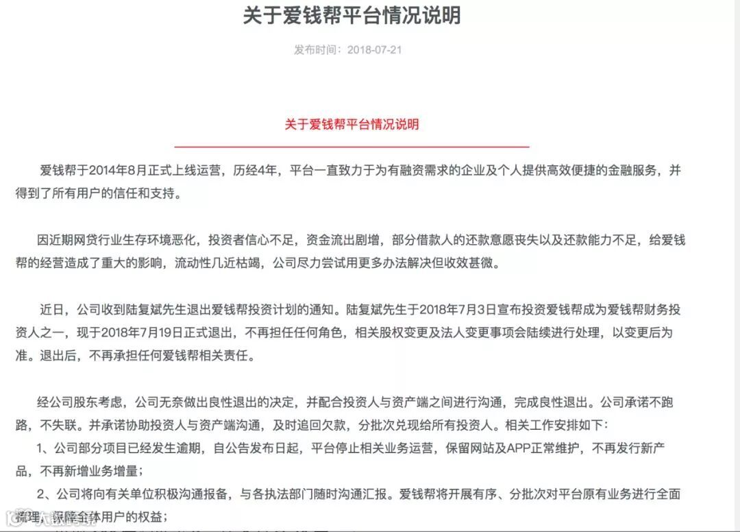 本在7月初刚刚宣布获得B+轮融资的爱钱帮在7月20日发布清盘公告,平台表示因网贷行业生存环境恶化,流动性几近枯竭,公司尽力尝试用更多方法解决但是收效甚微。同时,给予爱钱邦本次投资的陆复斌也不再担任该公司的任何角色,并不承担爱钱帮的相关责任。
