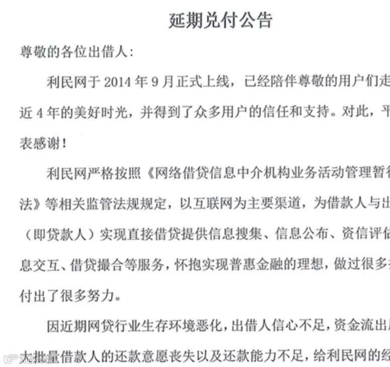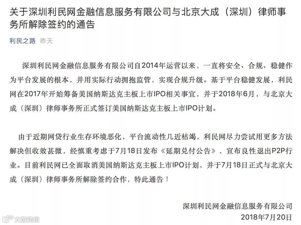 另外一家深圳平台利民网,7月18日突然发布公告称,因近期网贷行业生存环境恶化,造成利民网流动性枯竭,公司尝试解决但收效甚微,决定退出网贷行业,并且宣布已取消赴美上市的计划。