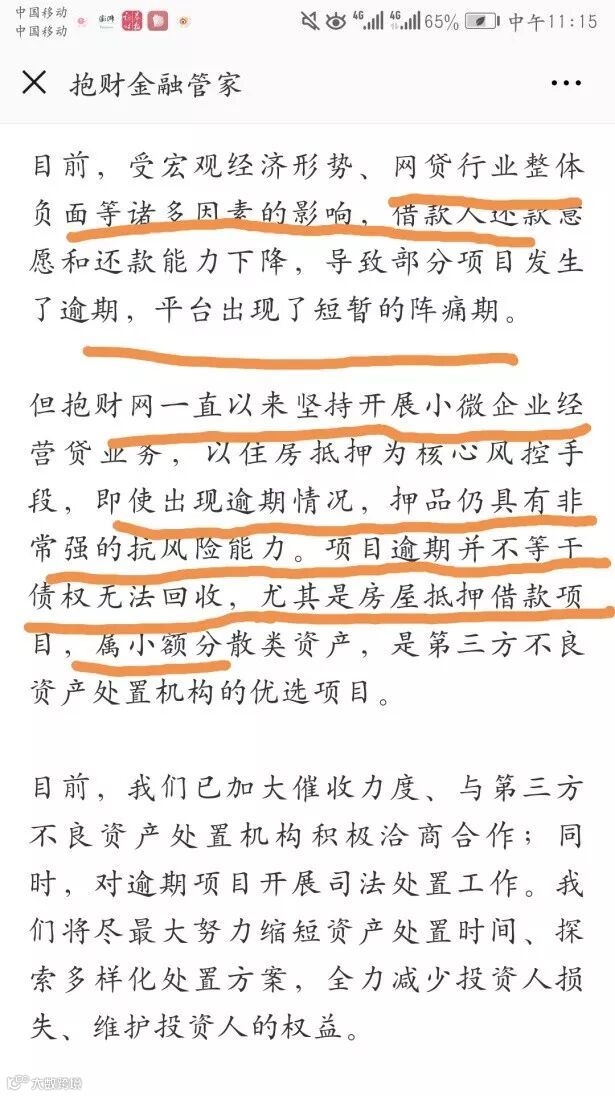 7月15日下午,抱财网创始人王尔明、张志威、徐展勤在其官方服务号“抱财金融管家”上发布逾期公告。公告称,目前,受宏观经济形势、网贷行业整体负面等诸多因素的影响,借款人还款意愿和还款能力下降,导致部分项目发生逾期,平台出现短暂的阵痛期。