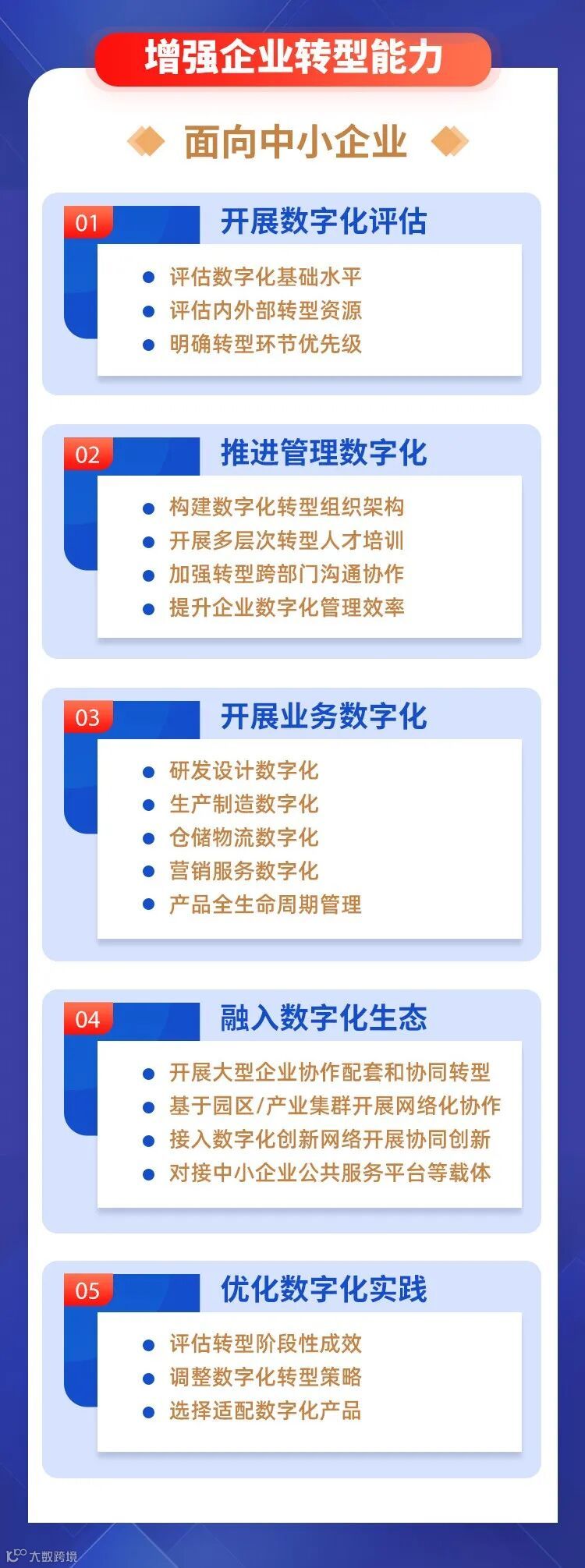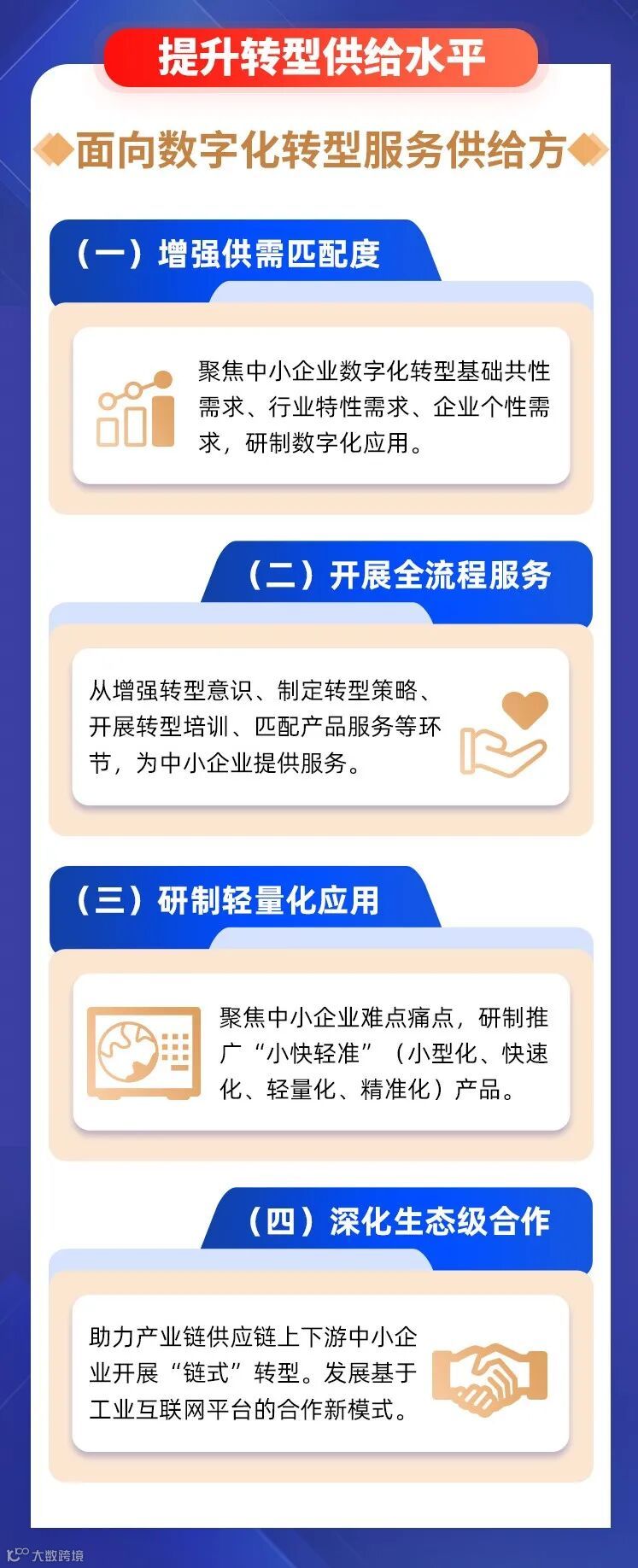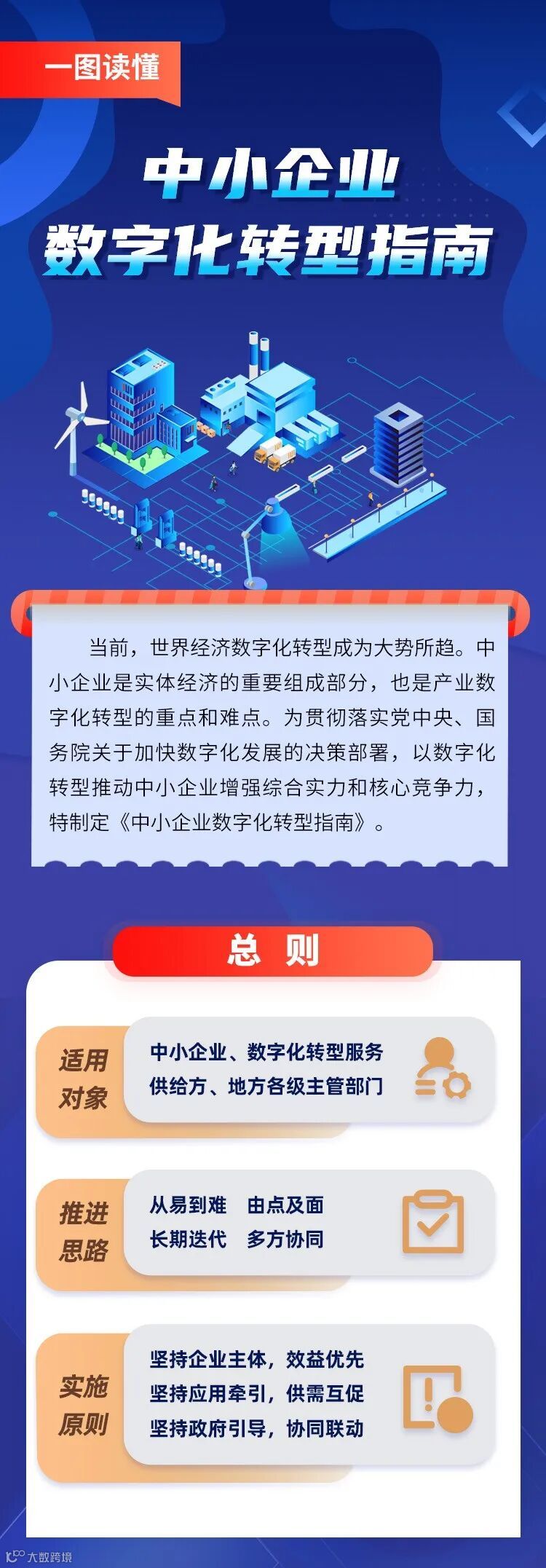 中小企业数字化转型遵循“从易到难、由点及面、长期迭代、多方协同”的思路。《指南》主要面向中小企业、数字化转型服务供给方和地方各级主管部门。《指南》旨在助力中小企业科学高效推进数字化转型,提升为中小企业提供数字化产品和服务的能力,为有关负责部门推进中小企业数字化转型工作提供指引。