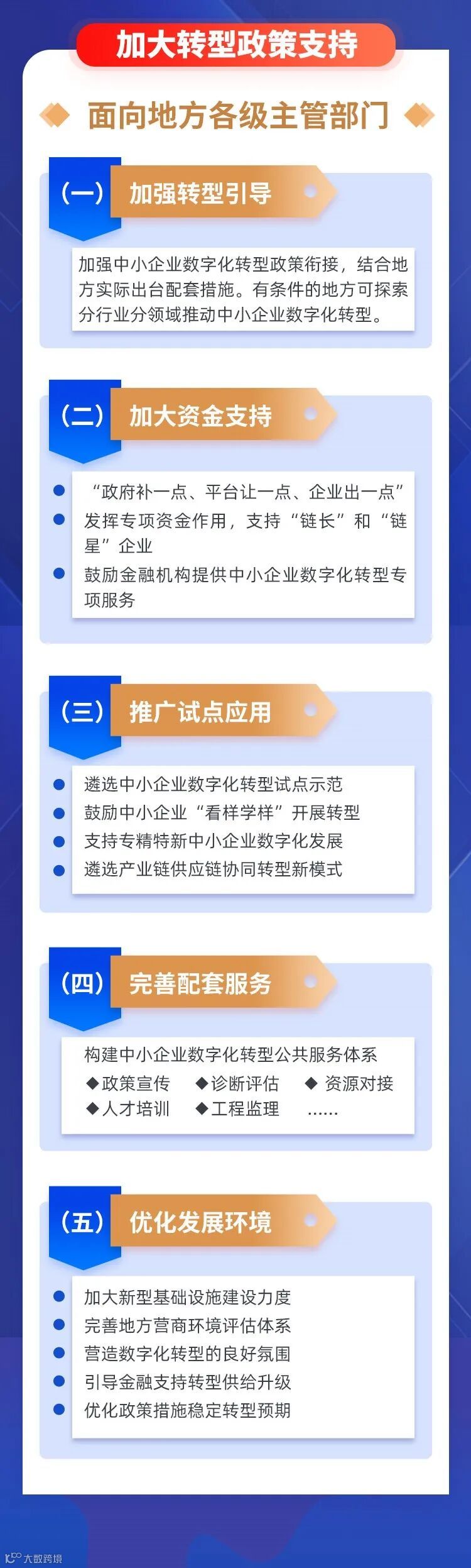 加大工业互联网、人工智能、5G、大数据等新型基础设施建设力度,优化中小企业数字化转型外部环境。建设完善地方营商环境评估体系,将中小企业数字化转型成效纳入考核范围。开展中小企业数字化转型相关会议和活动,营造良好发展氛围。发挥政府引导基金作用,带动社会资本支持中小企业数字化转型服务商做大做强。基于地方中小企业数字化转型实际,优化财税金融、人才培引等政策措施,稳定中小企业转型政策预期。