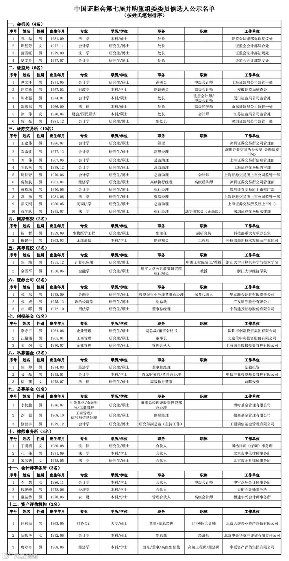 图:中国证监会第七届并购重组委委员候选人公示名单