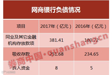 民营银行在吸收存款方面向来处于弱势,网商银行的负债数据显示,该行2017年吸收存款251亿元,和上一年相差不大。但是,该行2017年的同业及其它金融机构存放款项达到了381亿元,是上一年180亿元的2.11倍;拆入资金8亿元,而上一年仅5亿元。