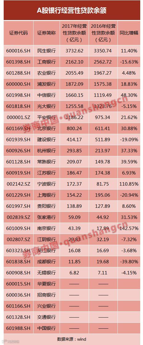 券商中国记者统计了A股26家银行过去两年的个人经营性贷款余额,不难发现,这之中,除了宁波银行、南京银行同比增幅在1倍以上,其它银行的同比增幅都在50%以下,且公布了数据的21家银行中有8家负增长。这之中,贷款余额最高的是以小微商贷业务见长的民生银行3733亿元,其它还有工行、农行、浦发、中信、光大、平安银行的经营贷余额突破千亿元,而其它公布了数据的A股上市银行2017年的个人经营性贷款余额,要低于网商银行的963亿元。