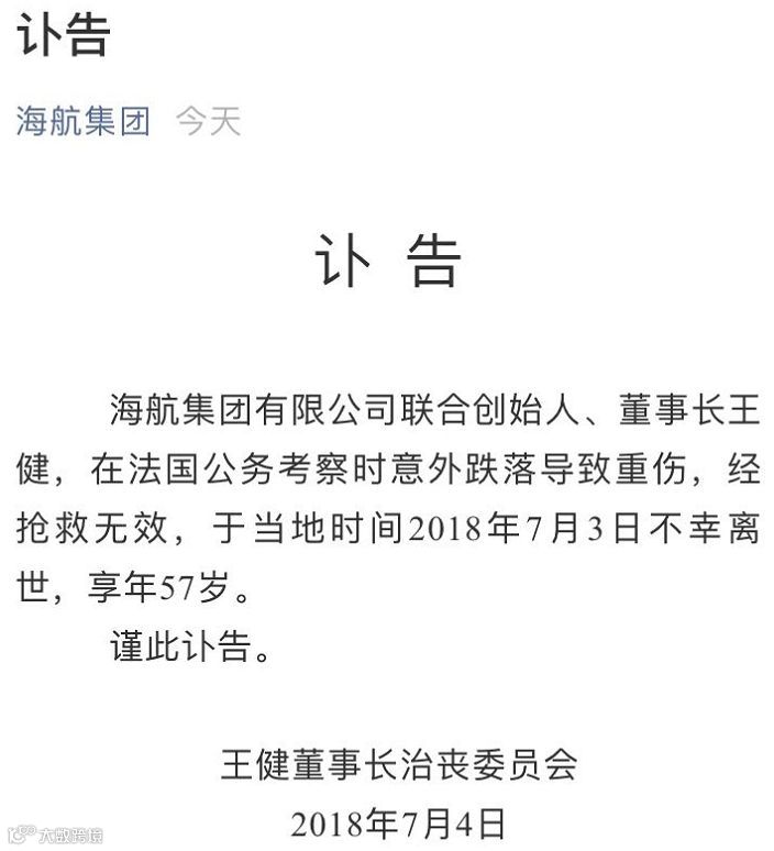 海航集团今日官方微信公众号发出的一则讣告显示,海航集团有限公司联合创始人、董事长王健,在法国公务考察时意外跌落导致重伤,经抢救无效,于当地时间2018年7月3日不幸离世,享年57岁。讣告的署名为王健董事长治丧委员会。