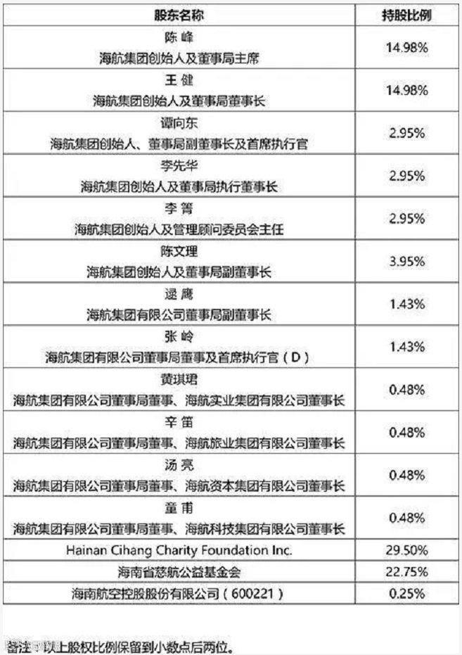 值得注意的是,海航集团2017年7月曾向集团所有员工发布公开信,信中披露了集团股权结构详情,包括自然人持股名单、持股比例、捐赠理念、捐赠计划等。公开信中写道,“基于所有股东的个人承诺——在离职或离世时向基金会捐赠其所有股份,基金会在海航集团的持股比例会继续增加。最终,海航集团将由慈善机构持有。”