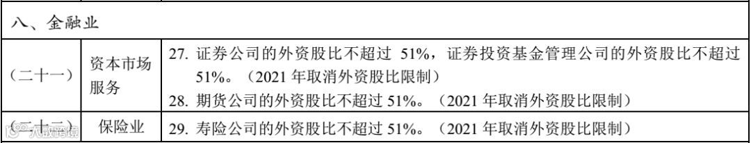 一是提到证券公司的外资股比不超过 51%,证券投资基金管理公司的外资股比不超过51%(2021 年取消外资股比限制);