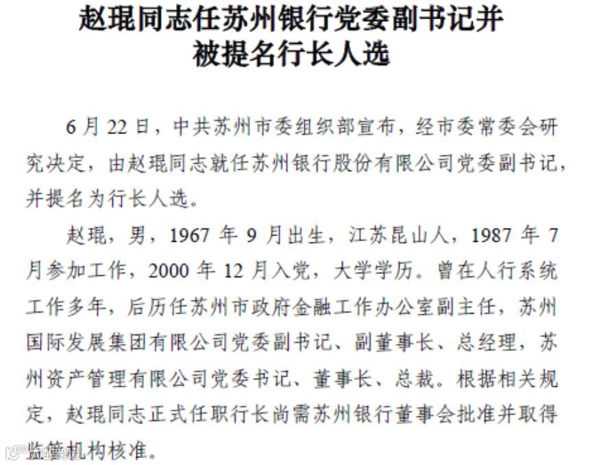 刚刚,券商中国记者从苏州银行方面获悉,6月22日,中共苏州市委组织部宣布,经市委常委会研究决定,由赵琨同志就任苏州银行股份有限公司党委副书记,并提名为行长人选。
