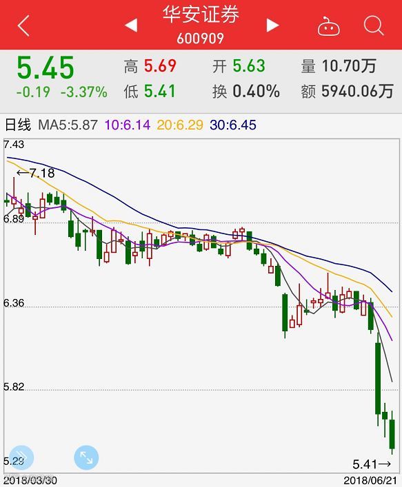 5月30日早盘,华安证券跳空低开0.92%后继续下跌,在6.41元附近短暂停留,临近午盘股价一波小跳水后便在发行价(除权后)附近窄幅震荡,尾盘受大盘拖累,发行价支撑位宣告失效,股价逐级震荡下行,盘中最低下探至6.15元,收报6.2元。今日收盘,华安证券报收5.45元,下跌3.37%。
