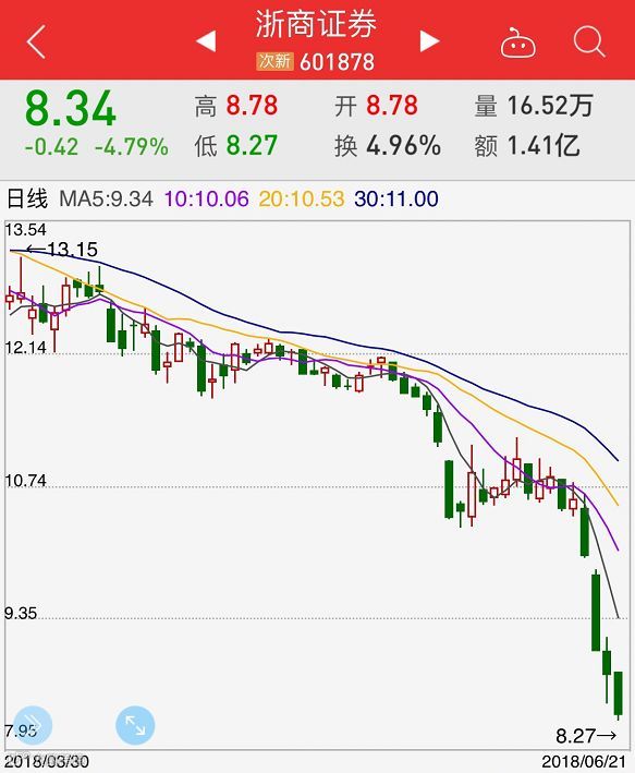 午后,浙商证券持续走低,截至收盘报8.34元,下跌4.79%,最低价报8.27元,跌破8.45元的发行价。