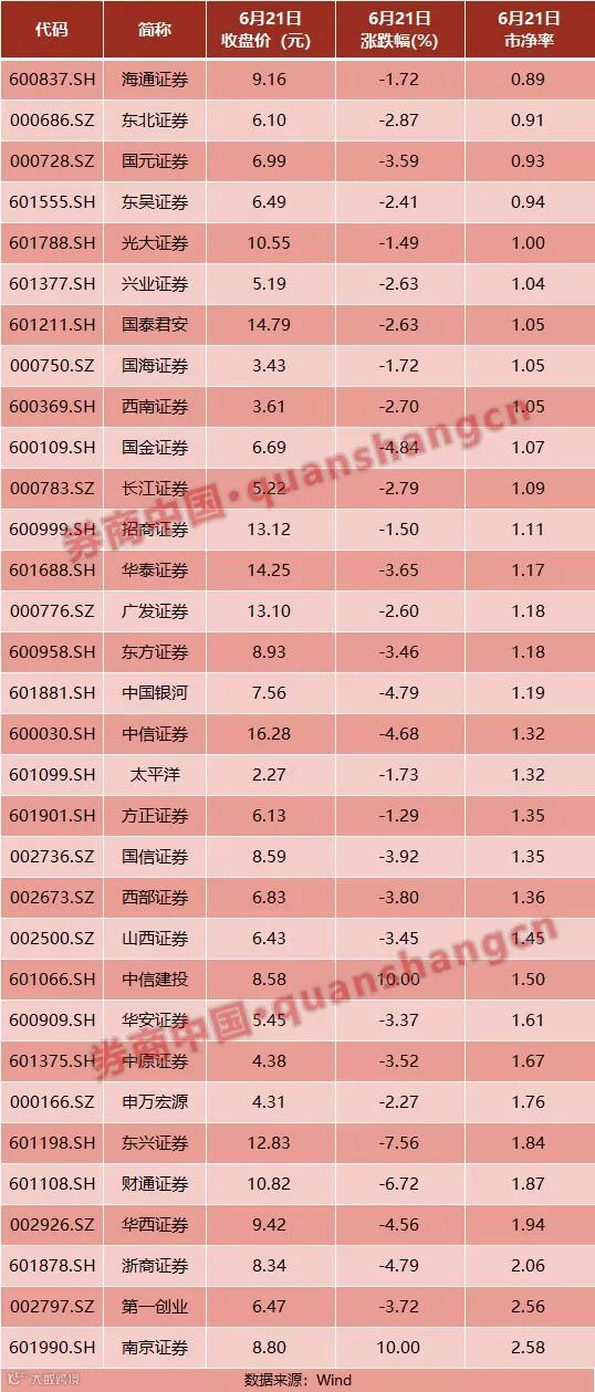 截至今日收盘,海通证券、东北证券、国元证券和东吴证券跌破净值。