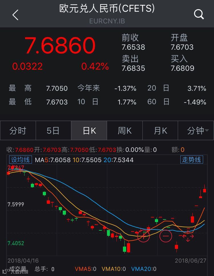 今天,在岸人民币兑欧元汇率,也一度下跌512个基点,最高报7.7050。最近20个交易日以来,贬值了3.71%,比美国最近跌幅2.71%的幅度,还要大。
