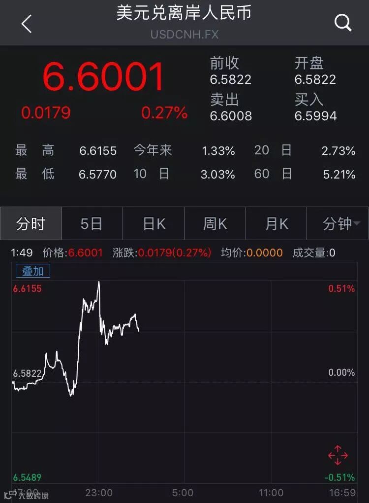 今天早盘,离岸、在岸人民币兑美元汇价急速下行,接连跌破6.60、6.61,在岸人民币兑美元汇率一度触及6.6171,下跌了611个基点。