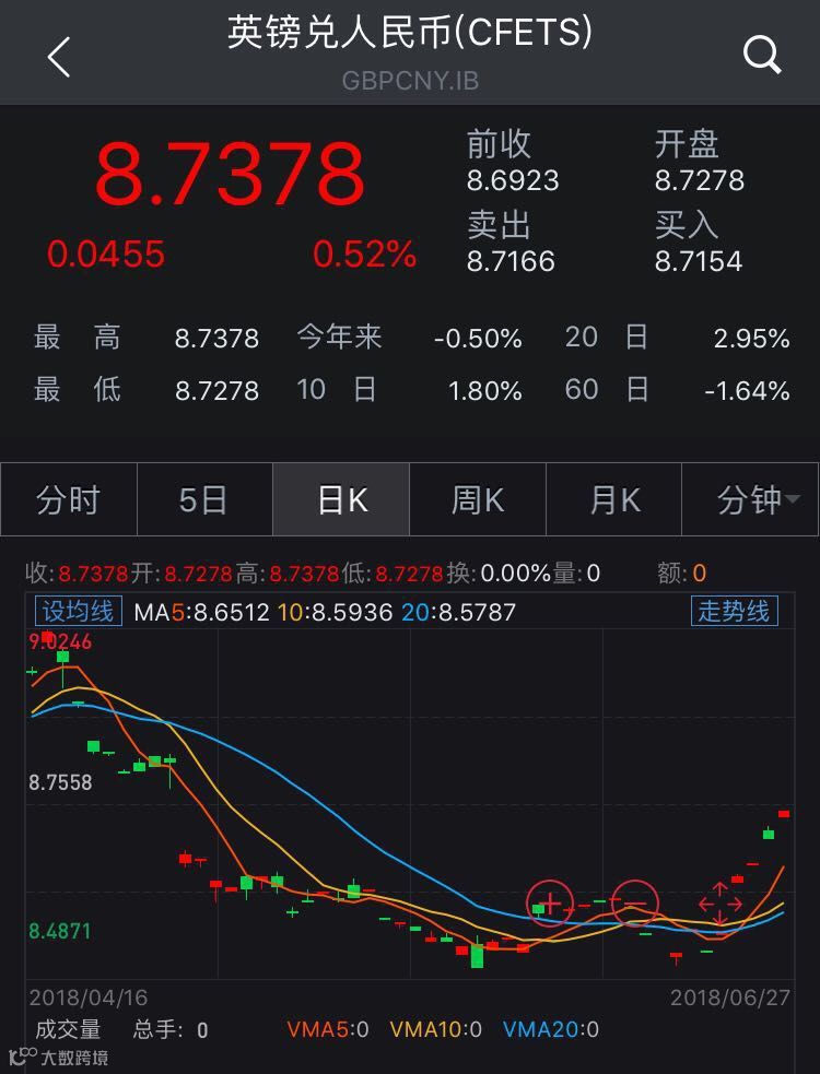 今天,人民币和英镑的汇率也出现了455个基点的贬值,最高到8.7378。最近20个交易日贬值幅度达到了2.95%。