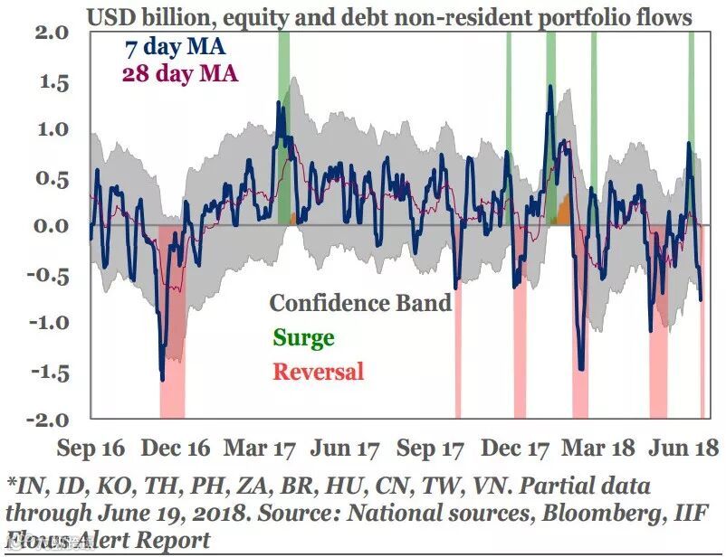 此前,阿根廷、土耳其、巴西货币已经大幅贬值,但是,随着中国新一轮汇率贬值的开启,亚洲新兴市场再度面临压力测试。从下图来看,美元资金在亚洲新兴市场快速退场。