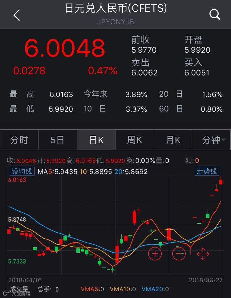 今天,人民币兑日元汇率也出现贬值,一度达到了293个基点,最高报6.0163。在最近10个交易日内贬值3.37%。