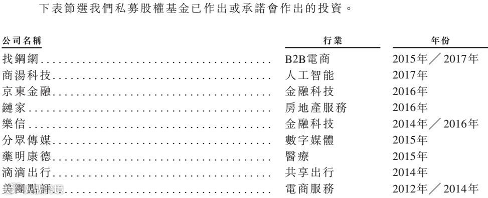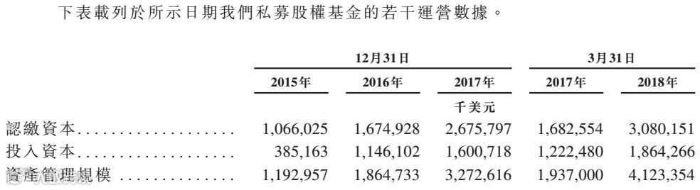 截至2018年3月31日,私募股权基金认缴承诺总额由0.62亿美元增至31亿美元,复合年增长率为256.5% 。自2013年推出首支私募股权基金至2018年3月31日,公司在新经济行业已投资约90家公司,投资金额19亿美元。2018年3月31日,私募股权业务的资产管理规模约41亿美元。